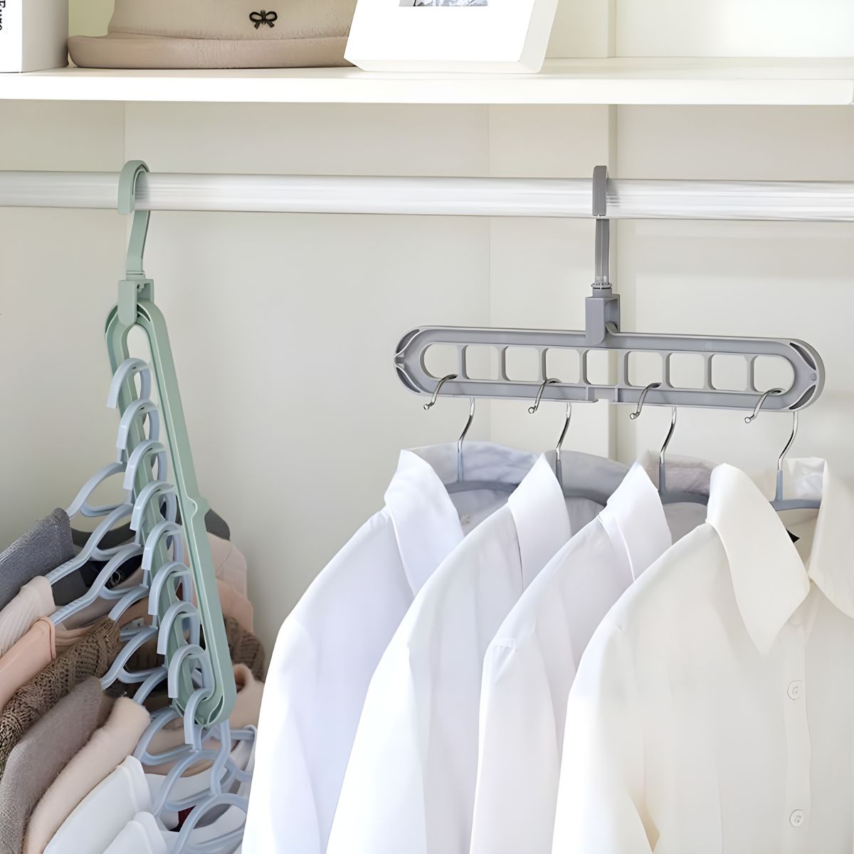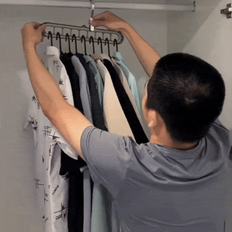 Each Multihanger has multiple slots that hold up to 9 garments — great for full outfits or categories like tops or trousers.